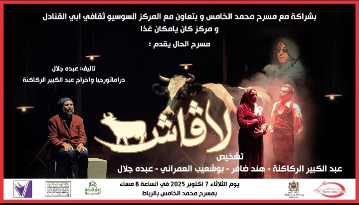 بشراكة مع مسرح محمد الخامس وبتعاون مع المركز السوسيوثقافي “أبي القناديل” ومركز “كان يا مكان غدا”، تقدم فرقة مسرح الحال بالرباط مسرحيتها الجديدة “لا فاش”، وذلك برسم الموسم 2026/2025، لمؤلفها الفنان “عبده جلال”، دراماتورجيا وإخراج الفنان عبد الكبير الركاكنة تشخيص الفنانين : هند ضافر – بوشعيب العمراني – عبده جلال وعبد الكبير الركاكنة، يوم الثلاثاء 07 أكتوبر 2025 بمسرح محمد الخامس بمدينة الرباط في الساعة الثامنة مساء.